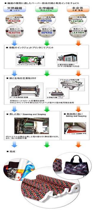 ペーパー捺染プリントは、ダイレクトプリントと同様、インクジェットプリンタによるデジタルプリントシステムで天然繊維(綿・麻・シルク・レーヨン・ウール)はもちろん、化学繊維(ポリエステル・ナイロン)への捺染をも実現します。