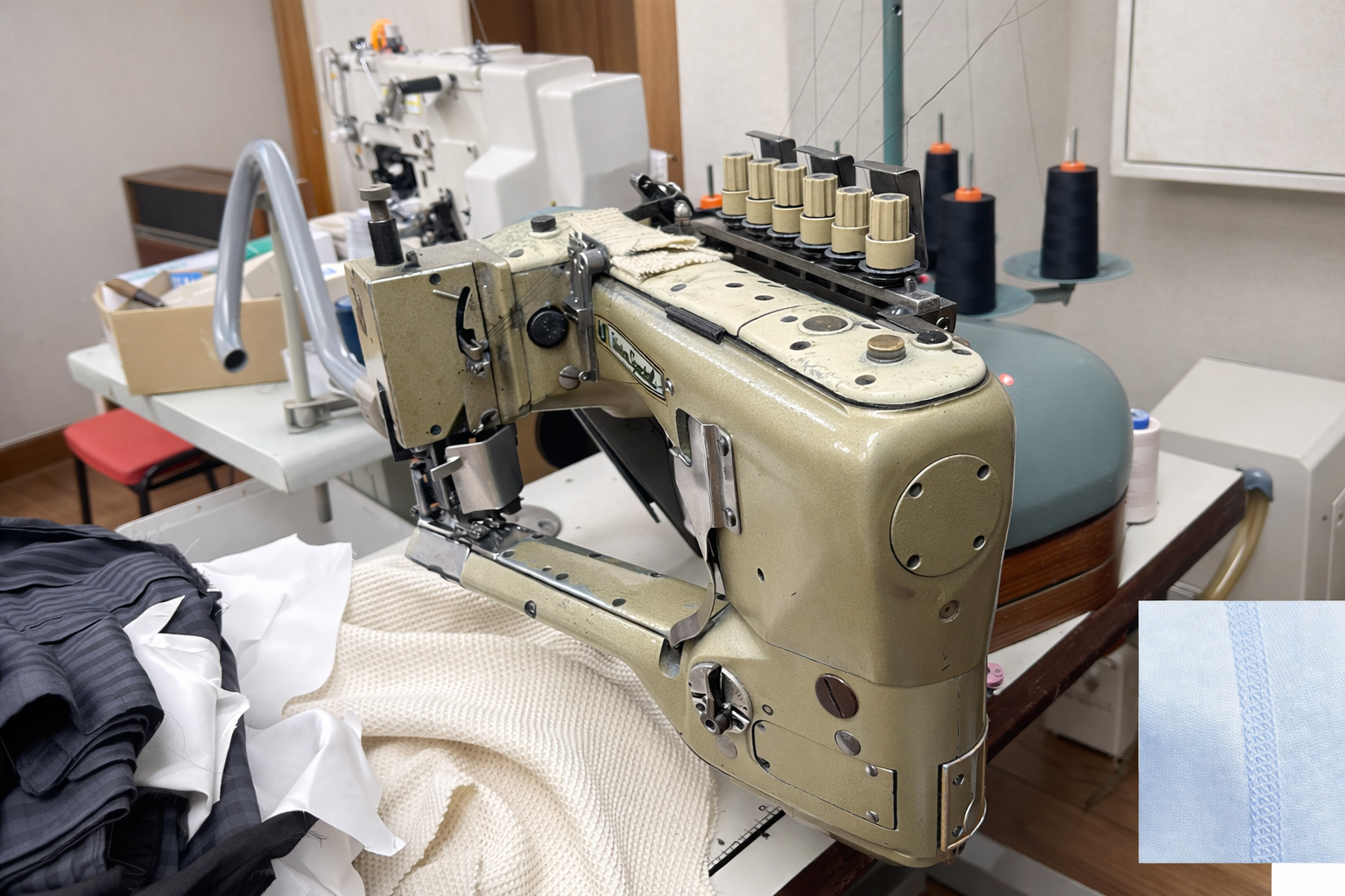 こ表は2本針ミシンと同じように見えますが、裏は間隔をほつれないようにかがっていくミシンです。オプションで、別の器具を付けることにより、表に飾り糸を出すこともできます。