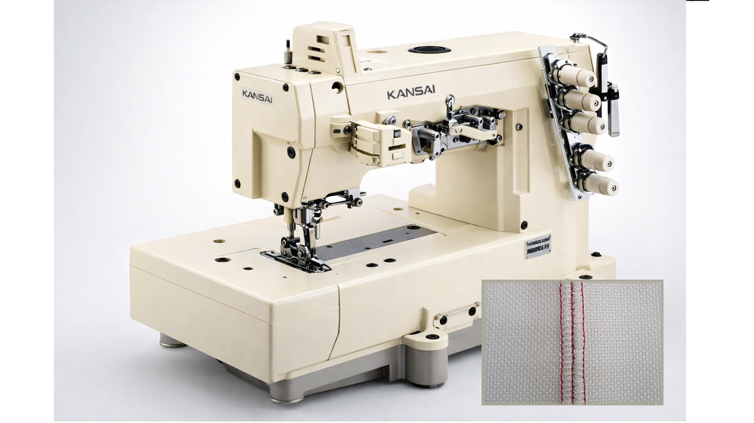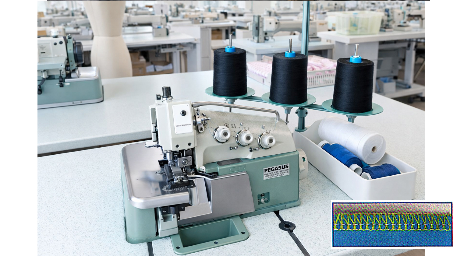 フラットシーマーでは、4本もしくは5本の針と6本の糸を使って2枚の生地を縫い合わせることができます。その際に平ら(Flat:フラット)な縫い目(Seam:シーム)ができるので、フラットシーマーと呼ばれています。